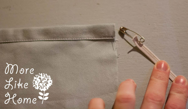 Pull the elastic through the casing until the other end lines up with the other side of the pocket (and take out the safety pin). Stitch along that side to hold the elastic in place.