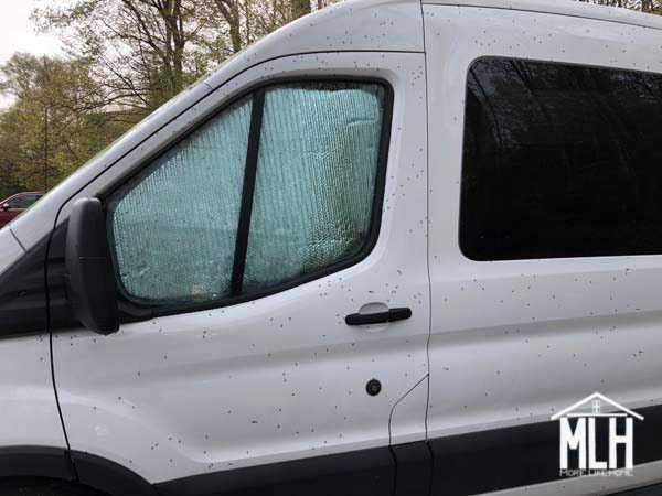 Hold or tape paper up over the inside of the window and trace around the edge of the window with a pencil. Full disclosure: I definitely used a sharpie, and completed the project with sharpie-filled dread. I do not recommend a sharpie and will not be held responsible if you get sharpie on your beautiful van. Sounds simple enough, right? More full disclosure: I was very sweaty and cranky by the time I finished this step. If you have an extra set of hands available, USE THEM. Turns out it's very difficult to wrangle a piece of crinkly paper over the larger windows. Use hands, use tape, use whatever you can find. Just get it done because, trust me, it will be so worth it! I mean, I hope I never have to do it again. But I will if I have to because these work great and we saved a small fortune over buying anything pre-made!